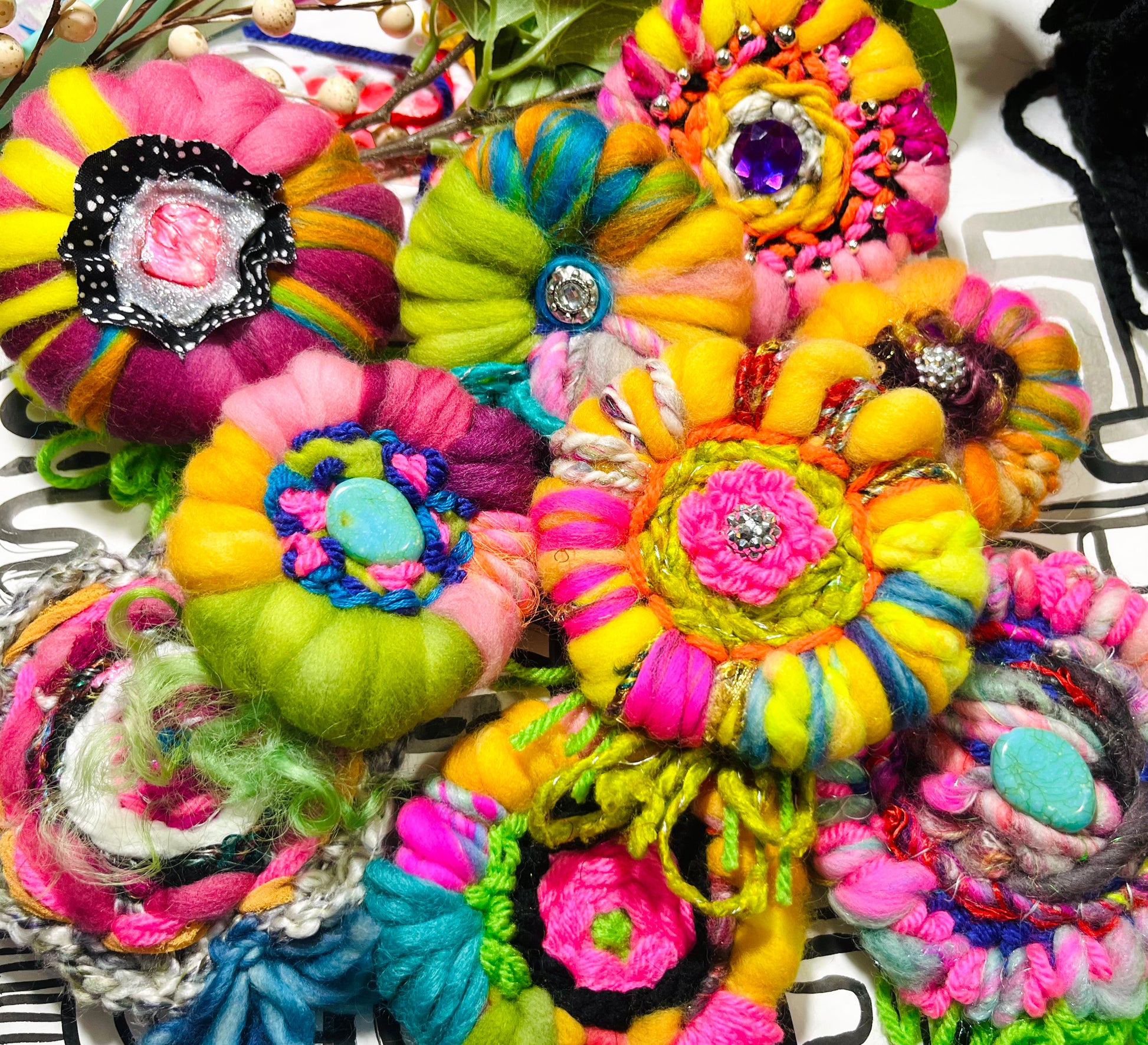 This brooch is made with wool roving, mohair, yarn and handspun art yarn, and a bead. It is Approx 3.5 inches.