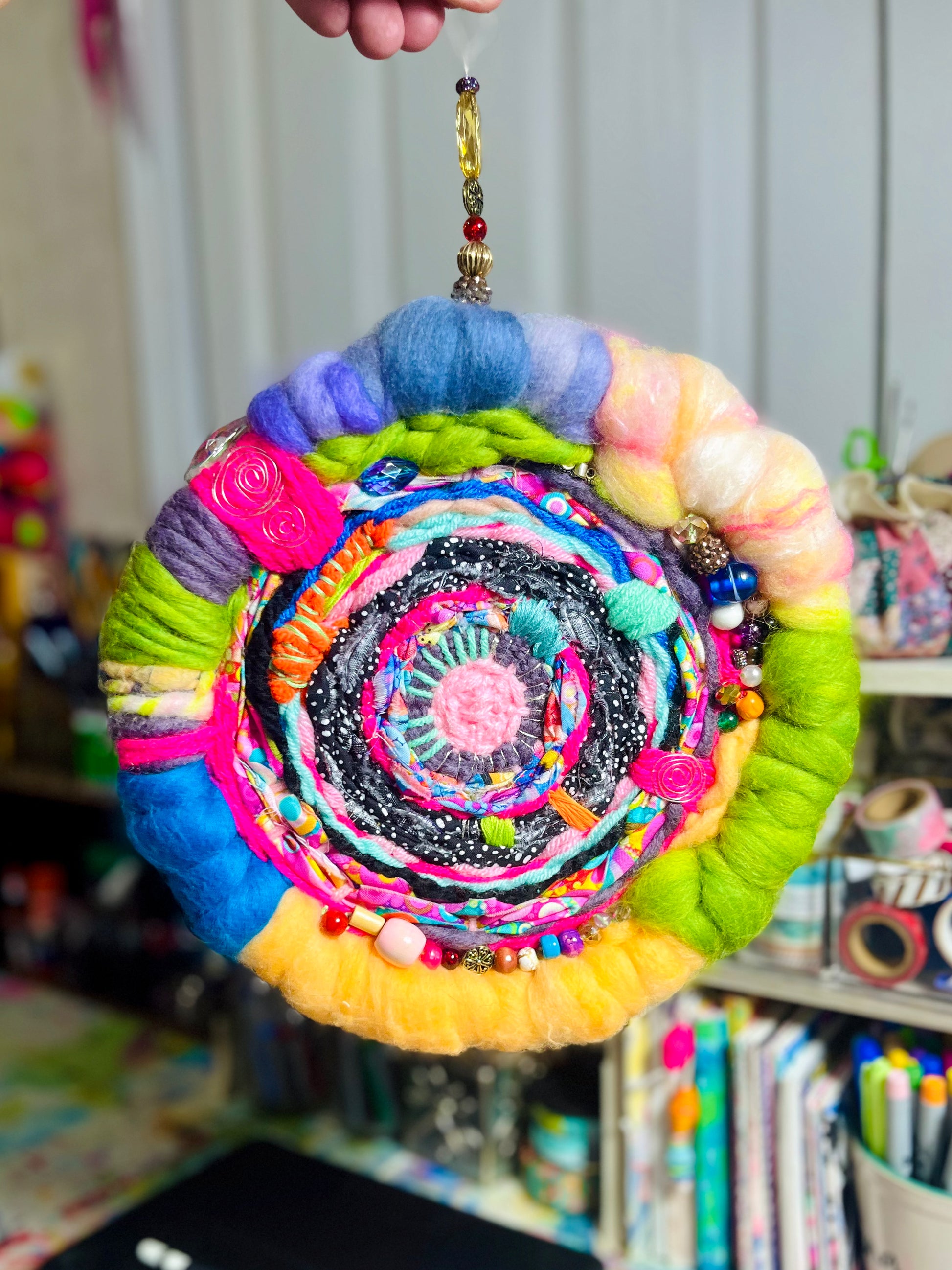 10 inch Fiber mandal with natural fibers, wool, yarn, fabric, beads, wire!😁