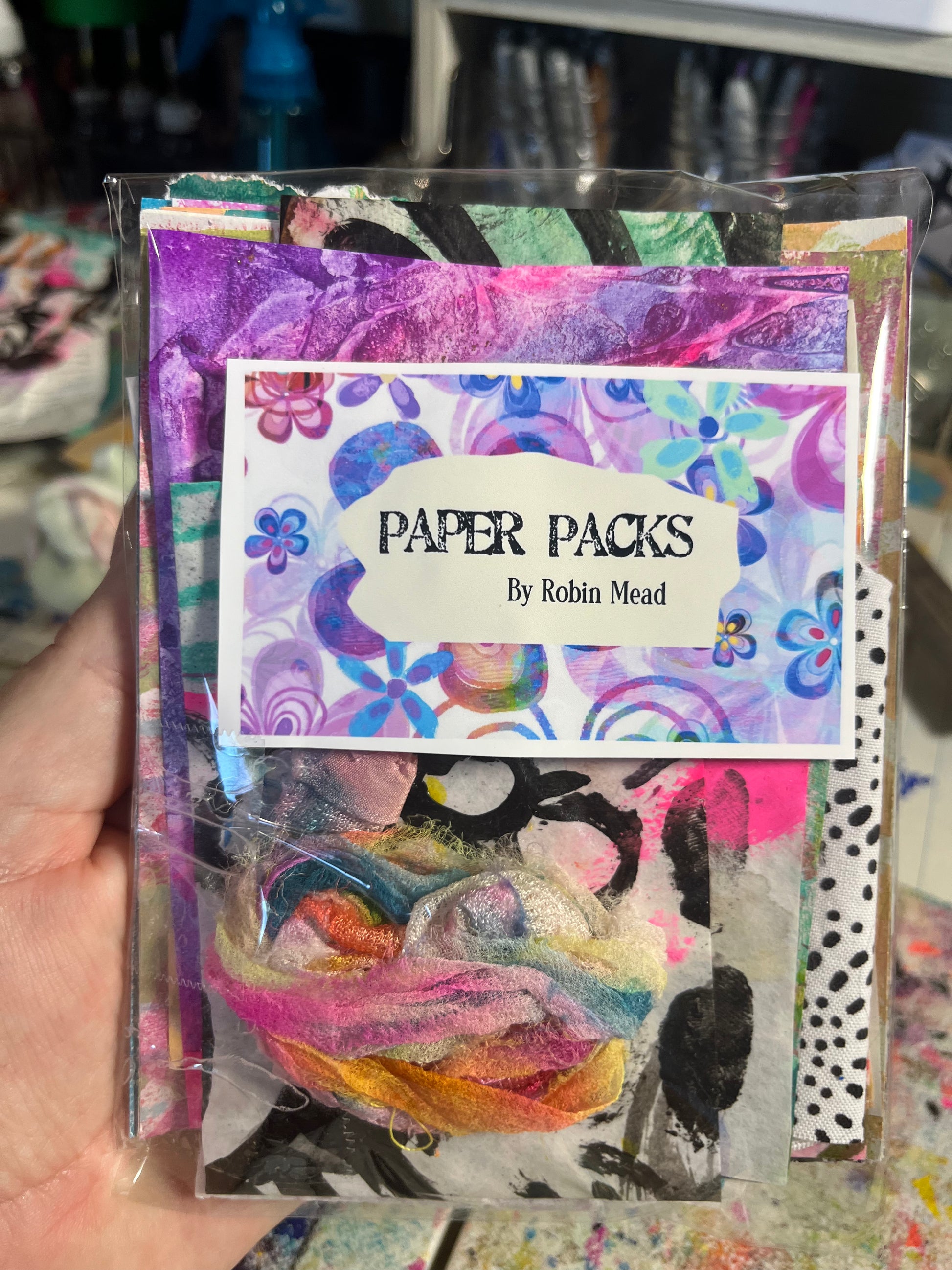 Each 6 x 4.5 goody pack has over 25 pieces of a mix of gelli prints, book pages, music, painted papers, map, rice paper, tissue, fabric bits from my collection and a few added surprises. The oapers include some from my friends Janet Briggs and Beth Wright❤️