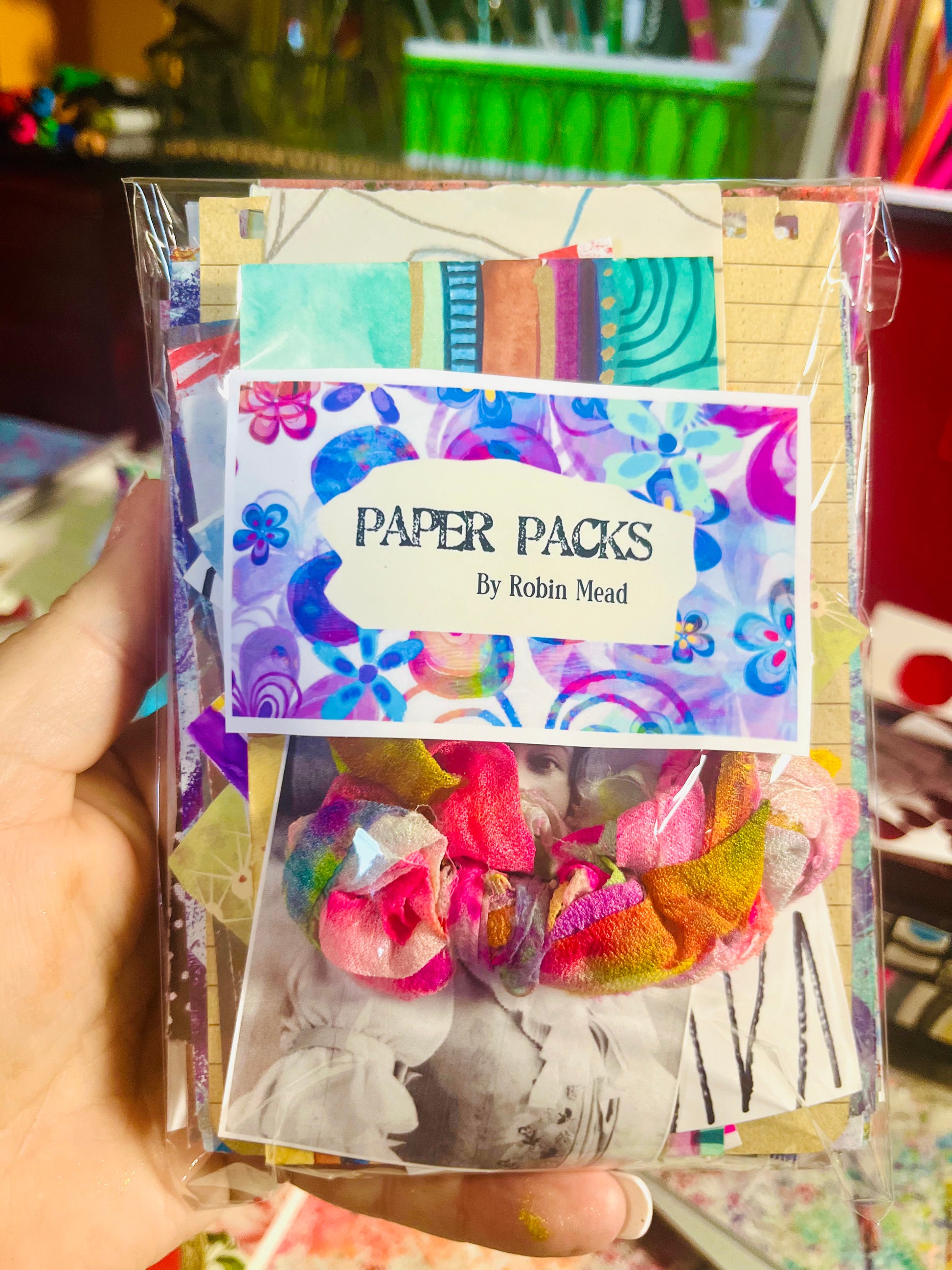 Each 6 x 4.5 goody pack has over 25 pieces of a mix of gelli prints, book pages, music, painted papers, map, rice paper, tissue, fabric bits from my collection and a few added surprises. The oapers include some from my friends Janet Briggs and Beth Wright❤️