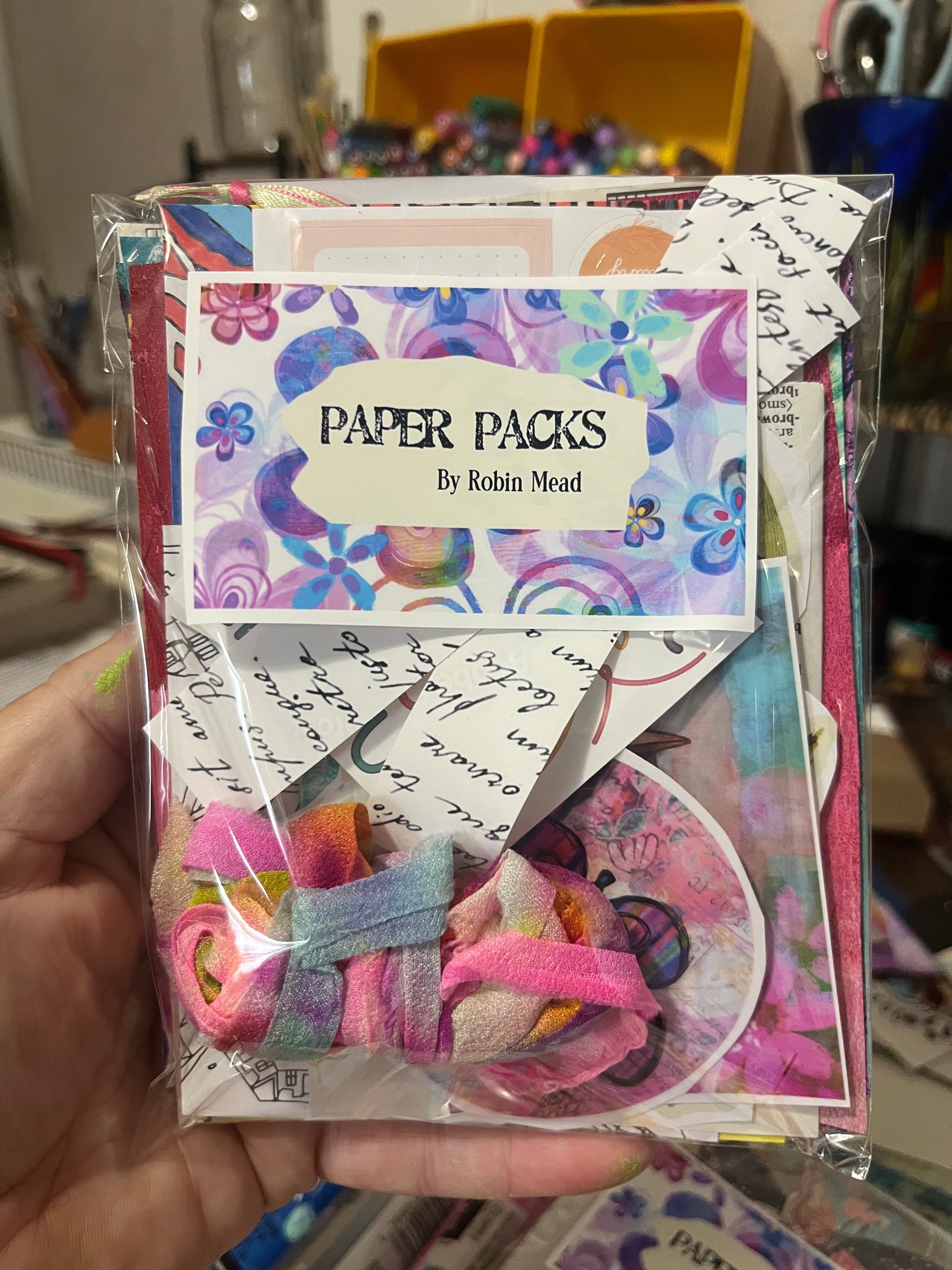 Each 6 x 4.5 goody pack has over 25 pieces of a mix of gelli prints, book pages, music, painted papers, map, rice paper, tissue, fabric bits from my collection and a few added surprises. The oapers include some from my friends Janet Briggs and Beth Wright❤️