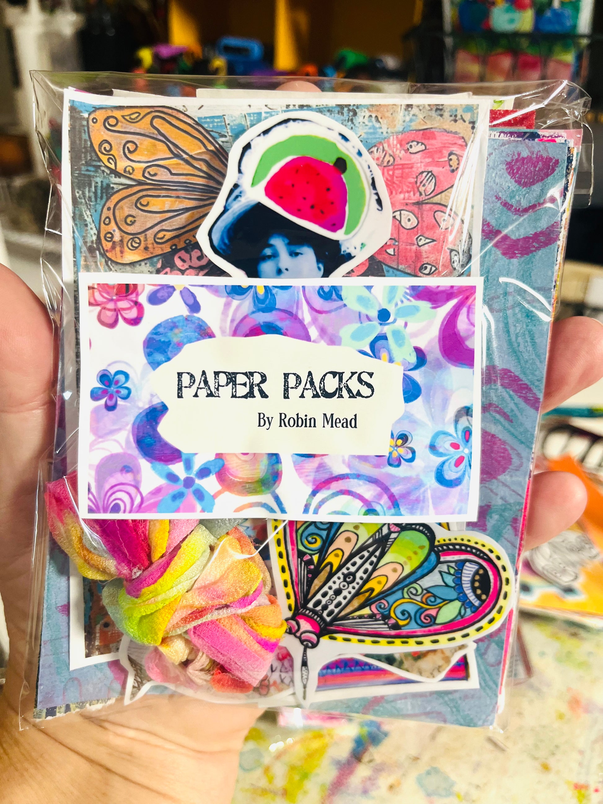 Each 6 x 4.5 goody pack has over 25 pieces of a mix of gelli prints, book pages, music, painted papers, map, rice paper, tissue, fabric bits from my collection and a few added surprises. The oapers include some from my friends Janet Briggs and Beth Wright❤️