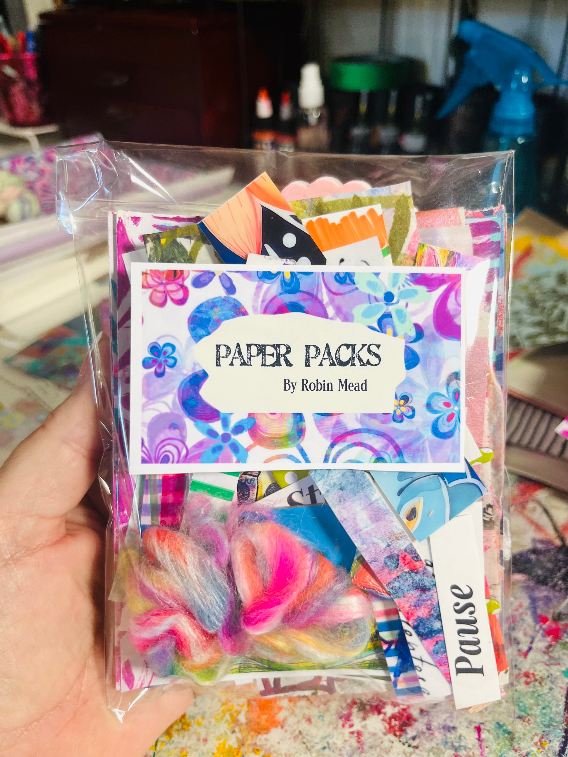 Each 6 x 4.5 goody pack has over 25 pieces of a mix of gelli prints, book pages, music, painted papers, map, rice paper, tissue, fabric bits from my collection and a few added surprises. The oapers include some from my friends Janet Briggs and Beth Wright❤️