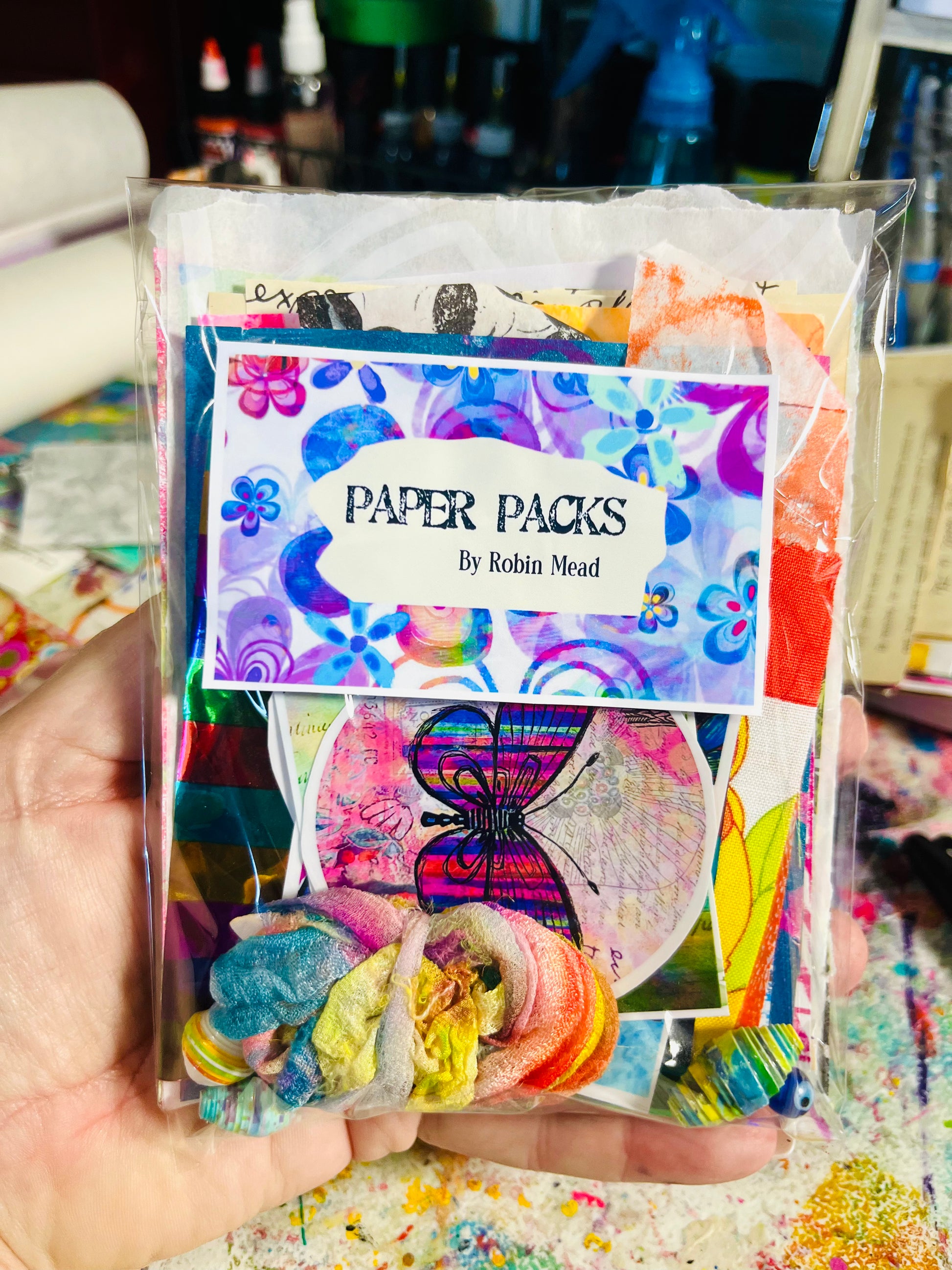 Each 6 x 4.5 goody pack has over 25 pieces of a mix of gelli prints, book pages, music, painted papers, map, rice paper, tissue, fabric bits from my collection and a few added surprises. The oapers include some from my friends Janet Briggs and Beth Wright❤️