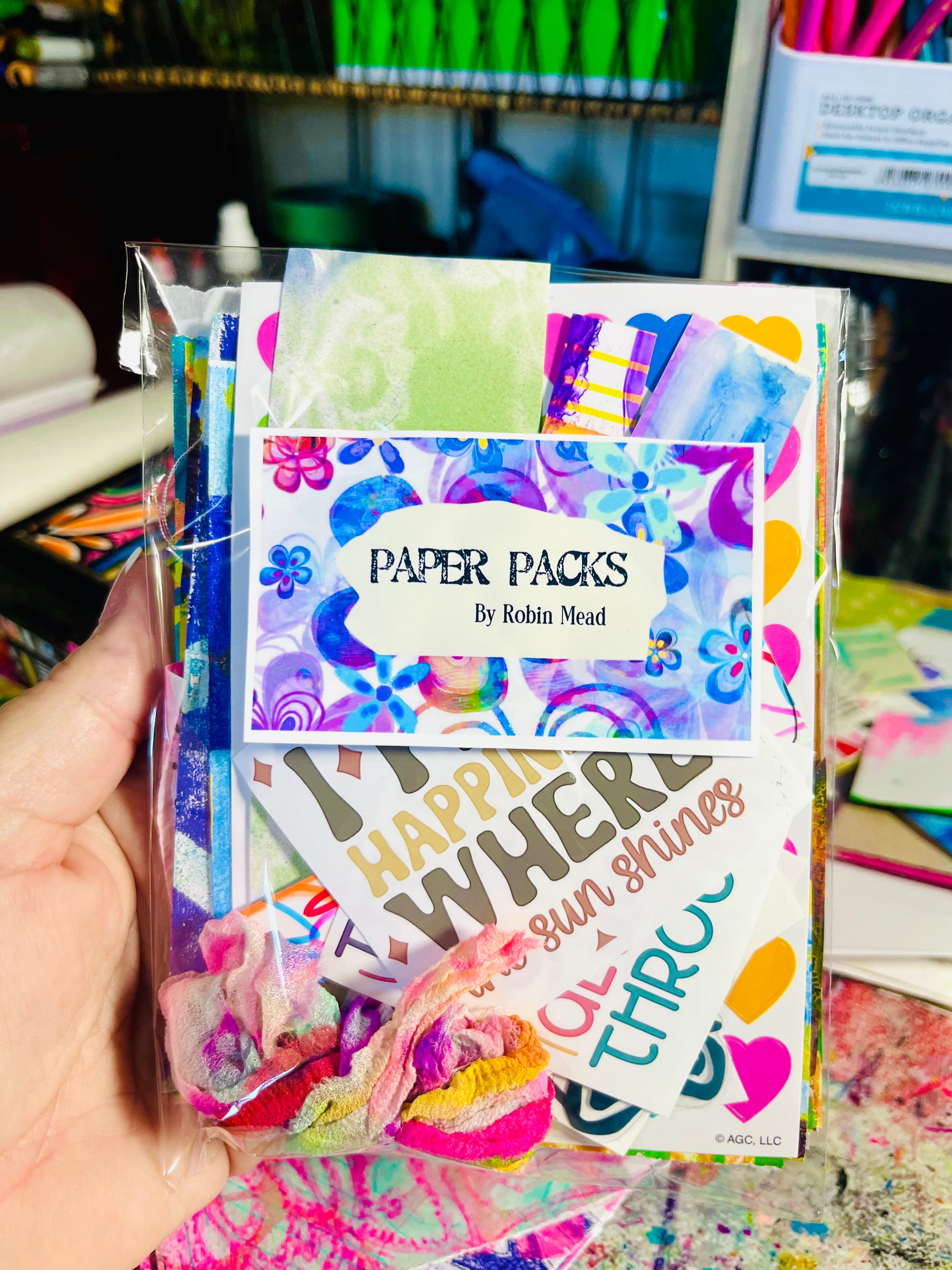 Each 6 x 4.5 goody pack has over 25 pieces of a mix of gelli prints, book pages, music, painted papers, map, rice paper, tissue, fabric bits from my collection and a few added surprises. The oapers include some from my friends Janet Briggs and Beth Wright❤️