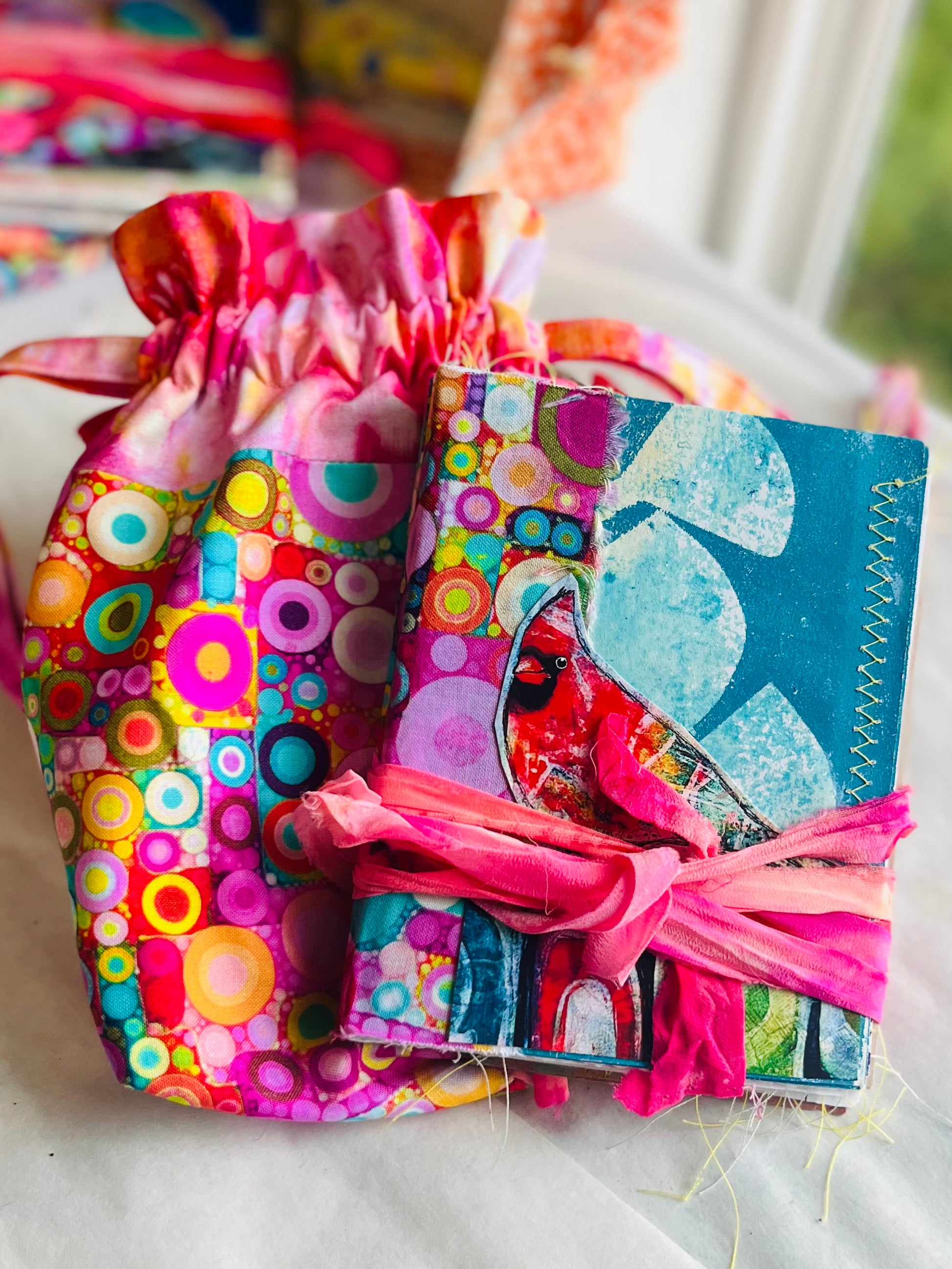 These 5.5 x 4 scrappy journal is created with scraps of art, gelli prints, ledger paper, under papers.. and many more, glued and stitched together for a one of a kind journal.. for all art, collage, writing, notes, pics and anything you'd love to add. Comes with a bag of surprises and extra goodies😁