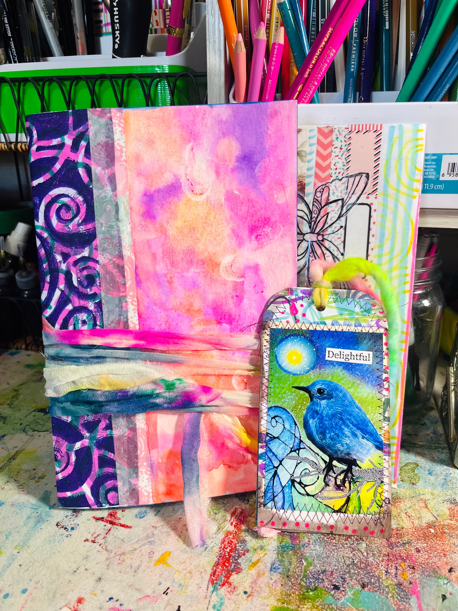 These 9 x 6 watercolor journal is created with watercolor paper in a flat lay style stitched in the binding for a one of a kind journal..and a beautiful goodie envelope... for all art, collage, writing, notes, pics and anything you'd love to add. Comes with a bag of surprises and extra goodies😁