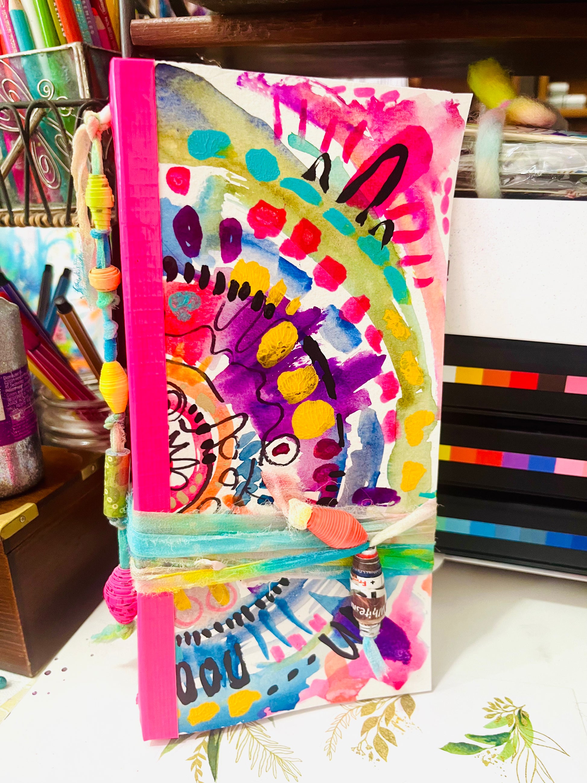 These 9x 4.5 inch chunky Meadori journals are created with four removable sections including lined notebook, watercolor paper, hand printed gelliprint, and a section of mixed collage papers. Each comes with a lil bag of surprises