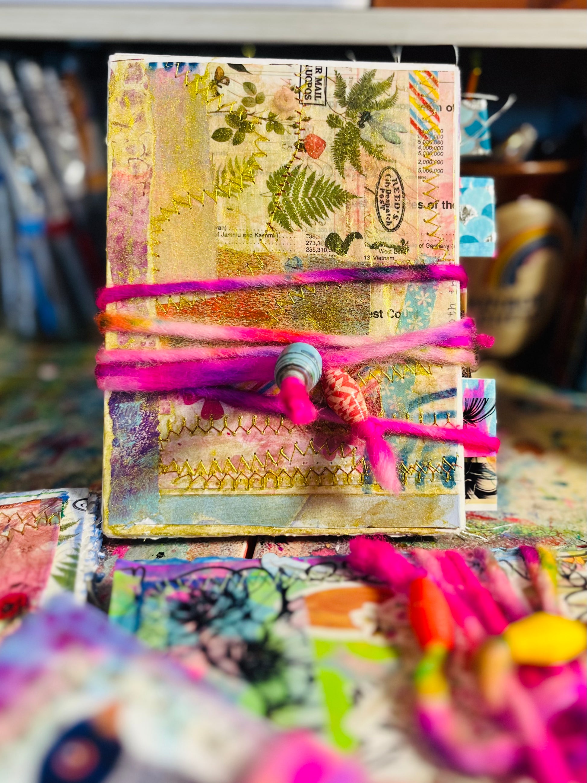 These 6x5 inch glue bound book is created with scraps of art, gelli prints, ledger paper, under papers.. and many more, glued and stitched together for a one of a kind journal.. for all art, collage, writing, notes, pics and anything you'd love to add. Comes with a bag of surprises and extra goodies😁