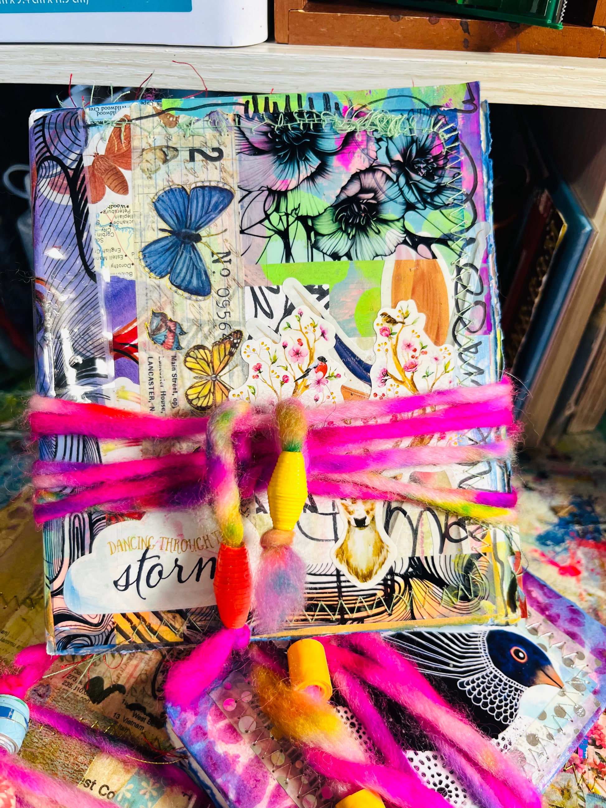 These 6x5 inch glue bound book is created with scraps of art, gelli prints, ledger paper, under papers.. and many more, glued and stitched together for a one of a kind journal.. for all art, collage, writing, notes, pics and anything you'd love to add. Comes with a bag of surprises and extra goodies😁