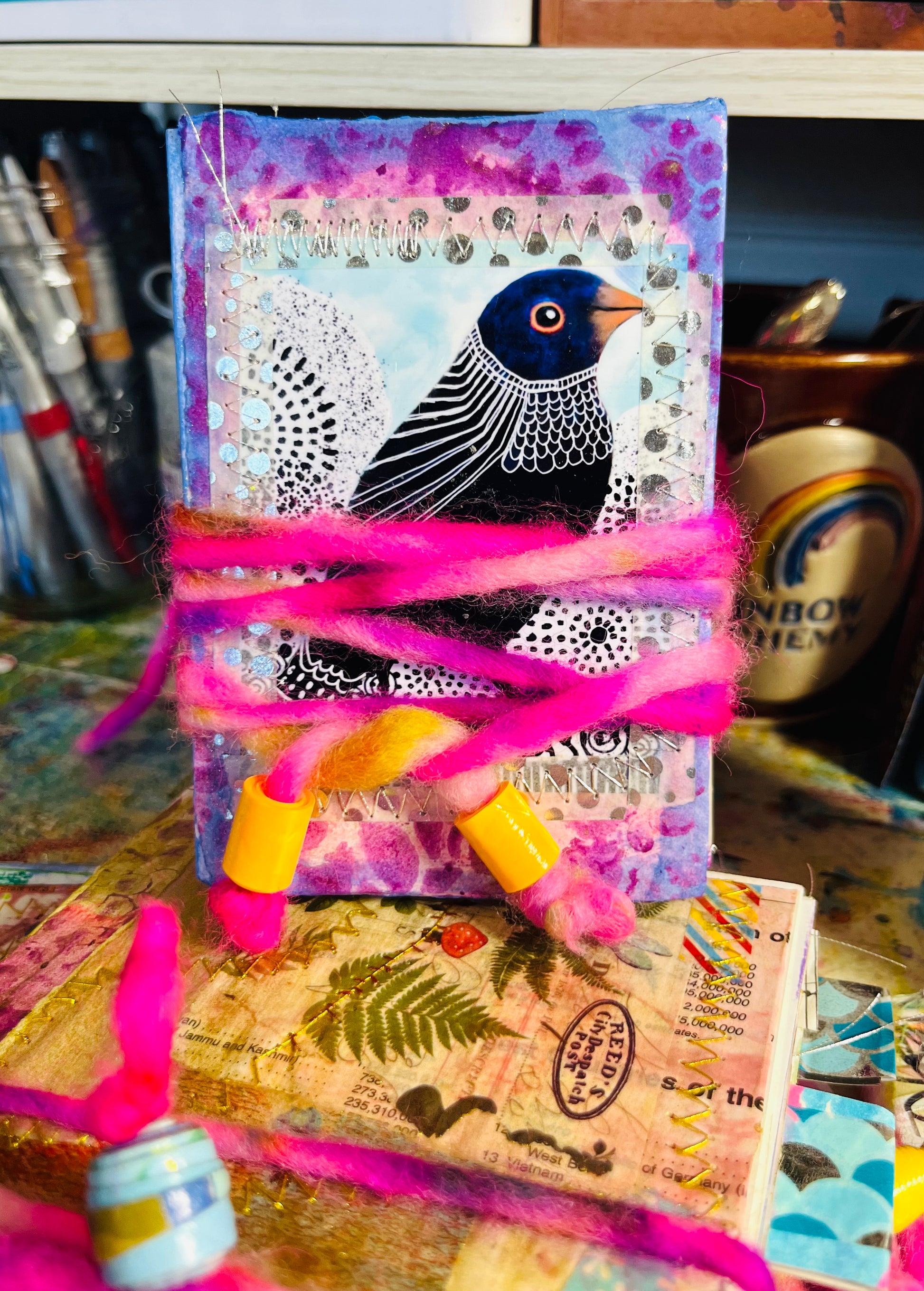These 4.5 x 3 1/4 inch glue bound book is created with scraps of art, gelli prints, ledger paper, under papers.. and many more, glued and stitched together for a one of a kind journal.. for all art, collage, writing, notes, pics and anything you'd love to add. Comes with a bag of surprises and extra goodies😁